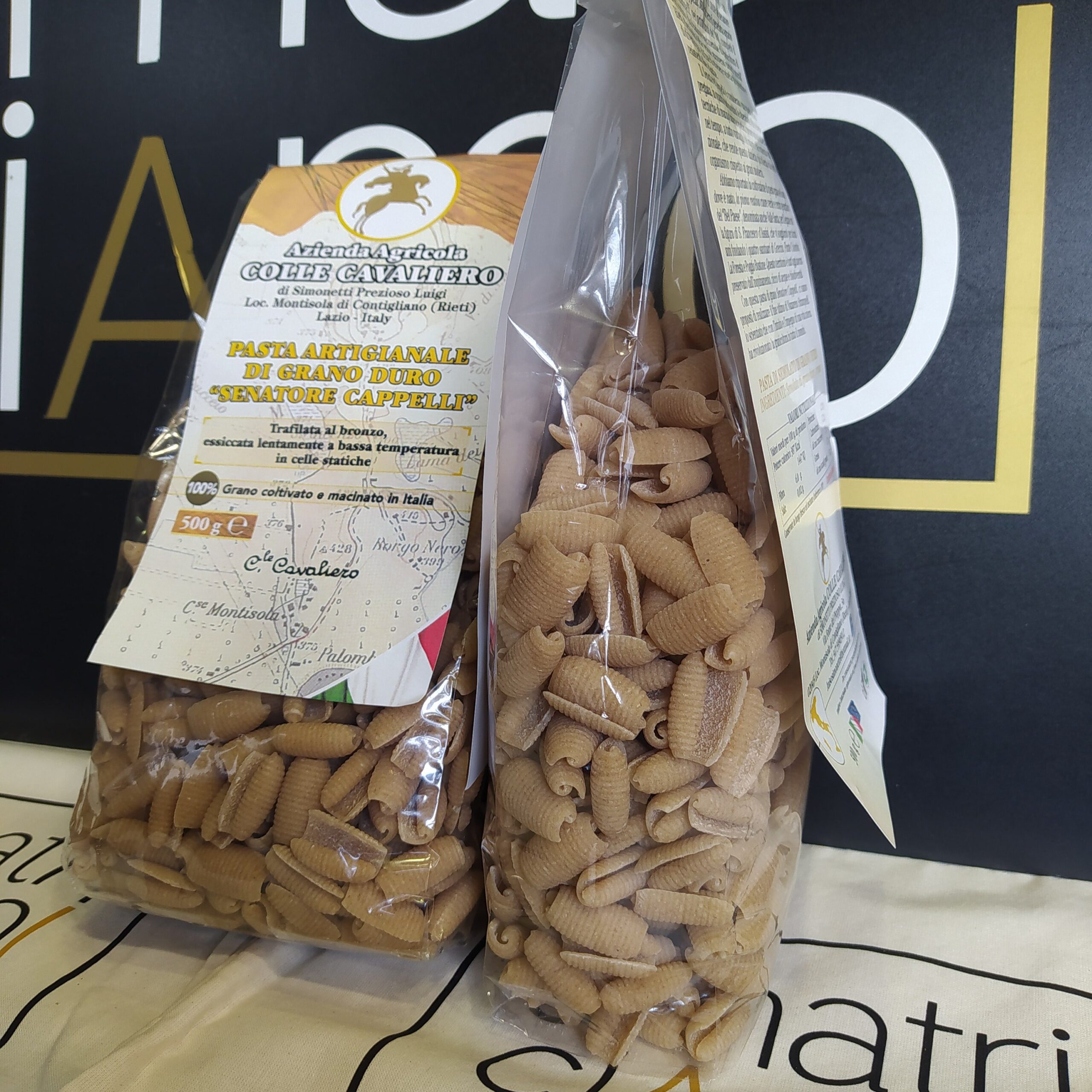 Pasta di elevata qualità, trafilata al bronzo, essiccata lentamente a bassa temperatura in celle statiche, con un indice glicemico minore rispetto al grano tenero e lavorata seguendo principi artigianali dei vecchi maestri pastai. Il frumento Senatore Cappelli è una varietà storica di grano duro il cui nome è in onore del Senatore abruzzese Raffaelle Cappelli - uno dei protagonisti della Riforma Agraria dei primi del 900, sulle cui terre il genetista agrario reatino Nazzareno Strampelli completò il suo lavoro di semine attraverso incroci "naturali" di diversi grani. Il grano così ottenuto è considerato una varietà pregiata che non ha subìto le alterazioni delle tecniche moderne di manipolazione, preservandone inalterato il sapore nel tempo, a vantaggio del gusto, del notevole contenuto proteico e del basso tasso di glutine che lo rende più digeribile e più tollerato dall'organismo.